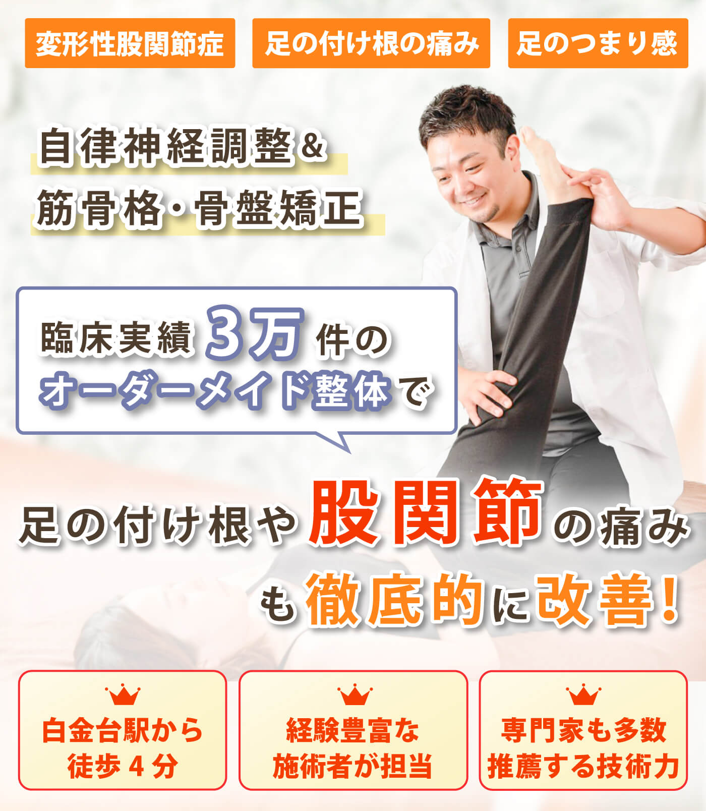 変形性股関節症、足の付け根の痛み、つまり感など股関節の痛みの施術経験が豊富な整体院です。施術して終わりではなく、その後の自宅でできるセルフストレッチや生活習慣の指導もいたします。